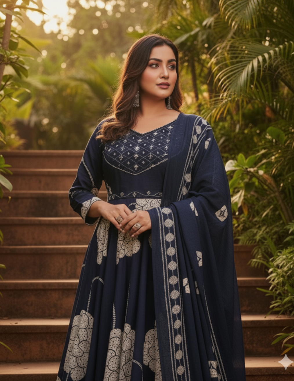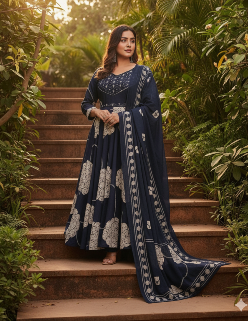 Sagarmal Present your look with this stunning navy blue Anarkali set, crafted from premium cotton fabric for ultimate comfort and elegance. The outfit features intricate white block prints and delicate embroidery on the neckline, adding a touch of traditional charm. The matching dupatta with coordinated floral motifs enhances the overall appeal. Perfect for festive occasions, family gatherings, or casual celebrations — this ensemble combines style, comfort, and sophistication effortlessly