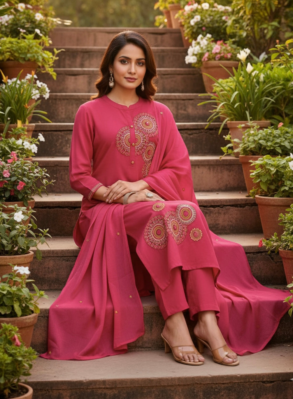 Sagarmal Present a beautiful and elegant three-piece ethnic set for women. It includes a soft, light pink kurta with intricate floral embroidery on the front. The kurta has a stylish A-line silhouette that flatters the body. The set also comes with matching pants and a dupatta, completing the sophisticated look. This ensemble is perfect for both casual wear and special occasions.