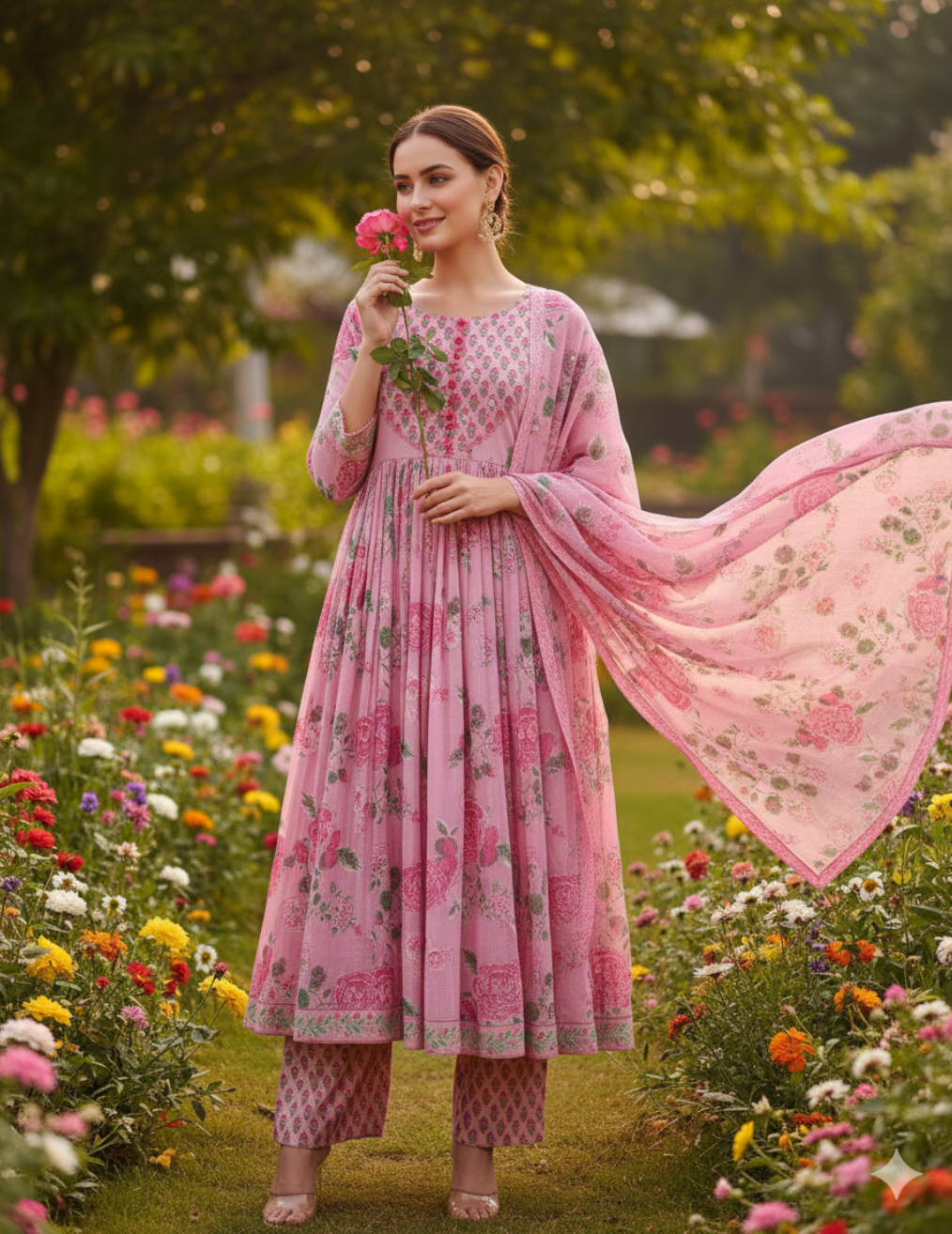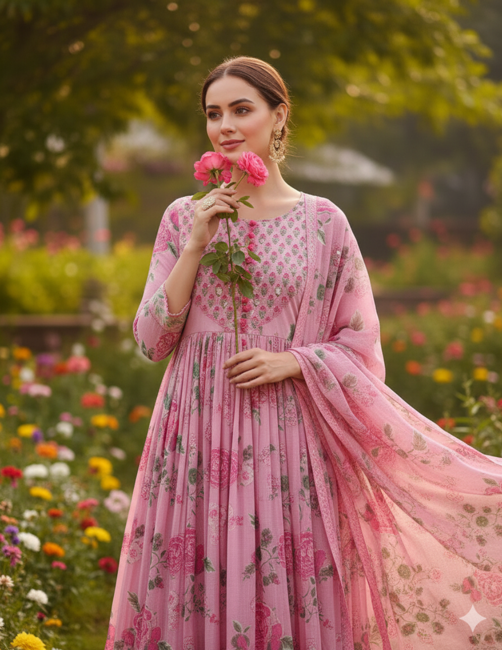 Sagarmal present a Graceful and timeless, this anarkali kurta set is a perfect blend of traditional elegance and modern style. The set features a floor-length, pink floral printed anarkali kurta with a voluminous flare that flows beautifully with every step. Adorned with a delicate all-over floral print of pink flowers and lush green leaves, this outfit exudes a fresh and charming appeal.
